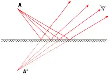 Para los rayos de luz que inciden en un espejo plano, el ángulo de reflexión es igual al ángulo de incidencia.[3] Ambos ángulos se miden entre cada rayo y la normal a la superficie, y las tres líneas rectas (las trayectorias de los dos rayos y la perpendicular a la superficie) pertenecen a un mismo plano. Por lo tanto, el ángulo de reflexión es el ángulo entre el rayo reflejado y la normal y un haz de luz colimada no se dispersa tras reflejarse en un espejo plano, si se exceptúan los efectos de la difracción.