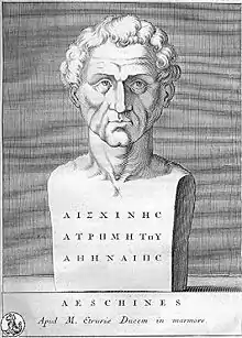 En el busto que se ve en la imagen de la derecha se lee: «Aeschines Atrometou Athenaios»; que significa: «Esquines de Atenas, hijo de Atrometos». Junto con Platón, Lisias o Jenofonte, Esquines fue uno de los discípulos de Sócrates que se vio en la obligación de poner por escrito la enseñanza socrática.