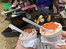 La palabra esquites o ezquites proviene del náhuatl izquitl,[3] de icehqui 'tostar (en comal)', y se referían al maíz tostado.[4][5] Bernardino de Sahagún refiere que los mexicas comían "mahiz tostado, que ellos llaman izquitlj", y se asociaba a la festividad de Cihuapipiltin.[6] En la religión de los wixárricas existe la Xarikixa o Fiesta del Esquite, una festividad religiosa.[7] Su venta en México ocurre en mayor medida de forma callejera[8][9] por las noches en carritos y puestos callejeros, así como en fiestas populares, plazas públicas y ferias. «Esquite» también es una forma de referirse a alguien tonto, idiota.[10]