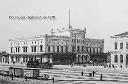 La estación principal de Dortmund tiene sus orígenes en la estación de "Compañía ferroviaria de Colonia-Minden" (CME para abreviar debido a la ortografía Kölns en ese momento), que se inauguró el 15 de mayo de 1847 al norte del centro de la ciudad. Dos años más tarde, la Compañía ferroviaria Bergisch-Märkische (BME) conectó su estación pura (adyacente, ligeramente al sur) cerró su estación operada como estación terminal con la estación existente la ruta del maletero terminó en Elberfeld, línea ferroviaria Elberfeld - Dortmund (hoy Wuppertal), la Ruta ferroviaria Dortmund-Soest (desde 1855) y la línea del área de Ruhr a Duisburgo y Oberhausen (desde 1860).