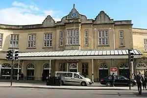 La Estación Bath Spa fue construida en 1840 para el Great Western Railway por Brunel, que ha sido catalogado como un monumento de Grado II*.[2] Se trata de un edificio de estilo neotudor asimétrico decorado con gabletes curvos, situado en la orilla norte del río Avon, donde la línea se curva desde la orilla sur hasta la estación.[3] Inaugurada el 31 de agosto de 1840, la estación se llamó "Bath" y pasó a llamarse "Bath Spa" en 1949 para distinguirla de la estación de Bath Green Park, cuyo nombre no cambió hasta 1951.[4]