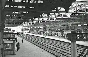 ![]() Vista hacia el sur de los andenes pasantes principales, con el túnel de Snow Hill al fondo (1967) |