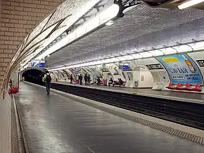 Está diseñada en bóveda elíptica revestida completamente de los clásicos azulejos blancos biselados del metro parisino, con la única excepción del zócalo que es de color marrón. Los paneles publicitarios emplean un marco dorado con adornos en la parte superior.