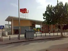 - Inicialmente se construyó una estación de carácter provisional,[3] hasta que se pudo inaugurar la definitiva. Además del edificio de viajeros, la estación contaba con un muelle de mercancías, una cochera de locomotoras y una rotonda, depósitos de agua, talleres de reparación, oficinas, etc.[4] Más adelante también se instalarían en las cercanías de la estación unos depósitos de combustible pertenecientes a la compañía CAMPSA, que contaban con una vía de apartadero.