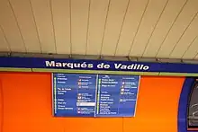 Marqués de Vadillo es una estación de la línea 5 del Metro de Madrid situada bajo la glorieta del mismo nombre, en el distrito de Carabanchel, en uno de los extremos del Puente de Toledo, Marqués de Vadillo es una de las entradas a Carabanchel desde el centro de Madrid.