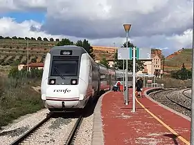 En la estación se detienen el MD de la serie 599 de Renfe que une Valencia con Zaragoza y el que une Valencia con Huesca.