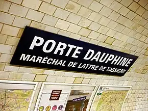 La estación da servicio a la prestigiosa Universidad Paris-Dauphine,fundada en 1968. Lleva el nombre de Porte Dauphine (Puerta del Delfín), en el Muro Thiers del siglo XIX. Lleva también el sobrenombre honorífico de Maréchal de Lattre de Tassigny, la plaza donde se ubicaba originalmente.