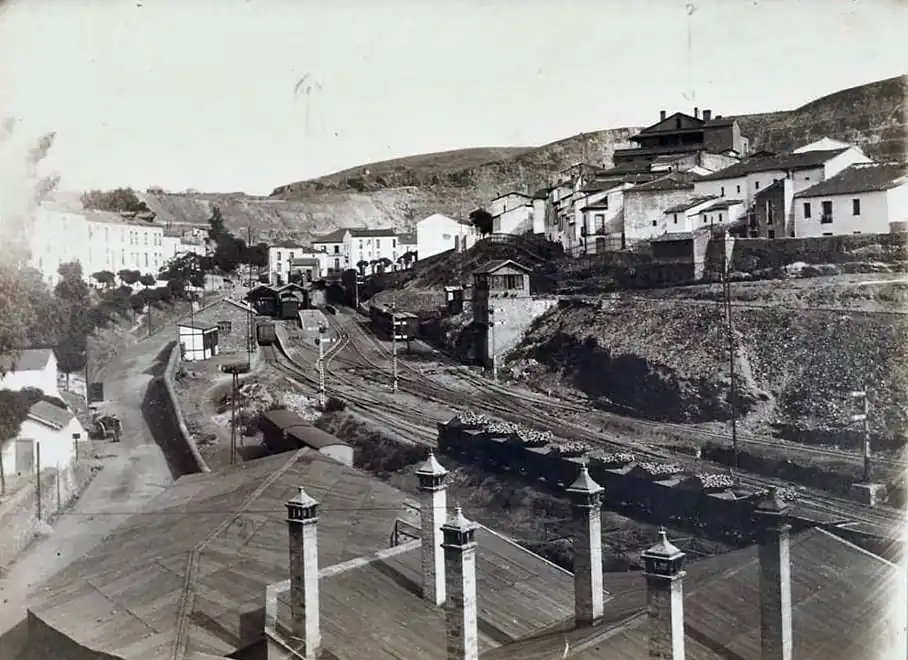 El ferrocarril de Riotinto, que entró en servicio en 1875,[2] sirvió para el transporte de minerales y mercancías. Más adelante también sirvió para el movimiento de pasajeros dentro de la cuenca minera. Debido a que las instalaciones de Río Tinto-Estación se encontraban alejadas del pueblo de Riotinto, la Rio Tinto Company Limited (RTC) decidió alargar el trazado y construir una nueva estación más cerca de la población.[3] La nueva estación recibió el nombre de «Río Tinto-Pueblo»,[4] si bien sería conocida de forma coloquial como la «estación de El Coso» por haberse levantado en el espacio que ocupaba una plaza de toros.[5] Las nuevas instalaciones pertenecían al ramal ferroviario que enlazaba Riotinto con Zalamea la Real, inaugurado en 1904.