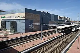 ![]() Vista de los andenes y vías con el edificio de la estación. | ||