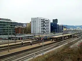 ![]() Vista de los andenes con el edificio de la estación de Zúrich Altstetten al fondo. | ||
