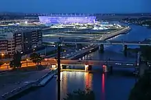Se ideó una fachada exterior colorida y geométrica, que consistía en triángulos agudos ordenados de tal manera que se ensamblaran en una sola estructura iluminada con luces led a orillas del Río Pregolya. También contaría con escalas de acceso en su exterior para facilitar el mismo, además de banderas pertenecientes a los equipos que jugaran cada partido de la Copa Mundial, techo fijo, no corredizo y estructura resistente a sismos. Especialmente, este estadio tendría la innovación de drenar aguas provenientes de inundaciones durante temporadas lluviosas debido a que se encontraría a orillas de un río.