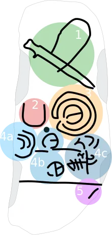 Este menhir antropomorfo, datado entre el 3200 al 2900 a. C., fue realizado en un bloque de granito de unas de 175 centímetros de altura, entre 63-70 cm de ancho y unos 30 cm de profundidad, de unos 800 kg.[4] En el frente, presenta grabado el equipo de un guerrero: cinturón, escudo, espada y lanza. También se puede reconocer un carro tirado por animales.[1][2] Es la representación de un carro más antigua que se ha encontrado en Galicia.[5]