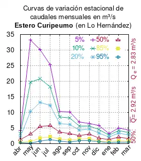 El caudal del río (en un lugar fijo) varía en el tiempo, por lo que existen varias formas de representarlo. Una de ellas son las curvas de variación estacional que, tras largos periodos de mediciones, predicen estadísticamente el caudal mínimo que lleva el río con una probabilidad dada, llamada probabilidad de excedencia. La curva de color rojo ocre (con ) muestra los caudales mensuales con probabilidad de excedencia de un 50%. Esto quiere decir que ese mes se han medido igual cantidad de caudales mayores que caudales menores a esa cantidad. Eso es la mediana (estadística), que se denota Qe, de la serie de caudales de ese mes. La media (estadística) es el promedio matemático de los caudales de ese mes y se denota .