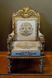 Las butacas (fauteuils), siempre de proporciones armoniosas, son muy variadas. Se distinguen por la forma de su respaldo: droit o en gondole. En esta época aparece la voltaire,[23] con un respaldo alto rellenado con una curvatura a la altura de los riñones que le hace muy confortable. La poltrona (bergère) es pesada, y lleva un gran cojín movible. Su estructura es la misma que la de las butacas.