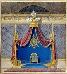La decoración interior contó con una plétora de artistas formados a finales del siglo XVIII o durante el Imperio: François-Joseph Bélanger,[13] Jean-Démosthène Dugourc (diseñador del garde-meuble), Jacques-Louis de La Hainay de Saint-Anges[14] (discípulo de Charles Percier y Alexandre-Théodore Brongniart) y Pierre-François-Léonard Fontaine (sucesor de Dugourc). El Recueil de décorations intérieures publicado durante el Imperio por Percier y Fontaine tenía todavía éxito, publicándose una nueva edición en 1827.[15]