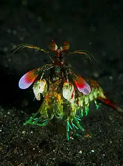 La región de la banda media del ojo de las mantis marinas se compone de seis hileras de ommatidios especializados. Cuatro de ellas tienen 16 diferentes tipos de pigmentos fotorreceptores, 12 tienen la sensibilidad para diferenciar los colores, los otros filtran el color. Ambos ojos pueden percibir la luz polarizada y poseen visión de color hiperespectral.[10] Cada ojo está sobre una antena móvil independiente del otro, permitiendo a ambos una percepción diferenciada y paralela. Estos ojos presentan variados colores y se considera que permiten una de las visiones más complejas del reino animal.[11][12]