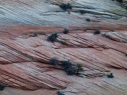 Los lechos cruzados son capas de sedimentos que están inclinados en relación con la base y la parte superior del lecho con el que están asociados. Los lechos cruzados pueden decirle a los geólogos modernos muchas cosas sobre los entornos antiguos, como el entorno de depósito, la dirección del transporte de sedimentos (paleocorriente) e incluso las condiciones ambientales en el momento de la deposición. Por lo general, las unidades en el registro de rocas se denominan lechos, mientras que las capas constituyentes que forman el lecho se denominan láminas, cuando son menos de 1 cm de espesor y estratos cuando son mayores de 1 cm de espesor.[1] Las camas cruzadas están en ángulo con respecto a la base o la parte superior de las camas circundantes. A diferencia de las camas anguladas, las camas transversales se depositan en ángulo en lugar de depositarse horizontalmente y se deforman más adelante.[8] Las camas transversales tienen superficies inferiores que son curvas o en forma de cuchara y truncan las camas subyacentes. Las camas del bosque también son curvas y se fusionan tangencialmente con la superficie inferior. Están asociados con la migración de dunas de arena.[9]