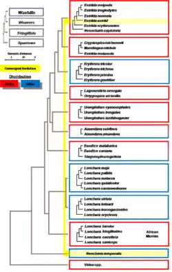 - Origen de EstrildinaeSibley CG, Monroe BL (1990). Distribution and Taxonomy of Birds of the World. Yale University Press