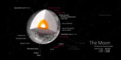 Varias líneas de evidencia implican que el núcleo lunar es pequeño, con un radio de aproximadamente 350 km o menos.[1] El tamaño del núcleo lunar es solo un 20 % del tamaño de la Luna misma, en contraste con aproximadamente el 50 %, como es el caso de la mayoría de los otros cuerpos terrestres. La composición del núcleo lunar no está bien limitada, pero la mayoría cree que está compuesta de aleación de hierro metálico con una pequeña cantidad de azufre y níquel. Los análisis de las rotaciones variables en el tiempo de la Luna indican que el núcleo está al menos parcialmente fundido.[3]