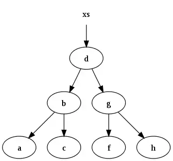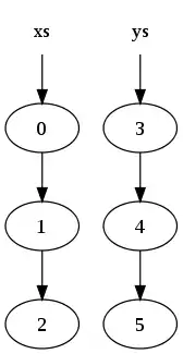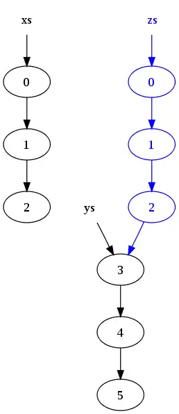 Notar que los nodos en la lista xs han sido copieados, pero los nodos en ys son compartidos. Como resultado, las listas originales (xs y ys) persisten y no han sido modificadas.