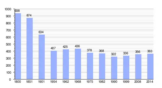 Los datos demográficos contemplados en este gráfico de la comuna de Estry[4] se han cogido de 1800 a 1999 de la página francesa EHESS/Cassini, y los demás datos de la página del INSEE.[5]