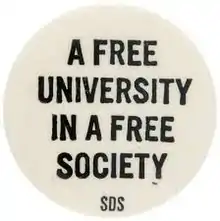 Los diversos capítulos del SDS siguieron con su postura anti-bélica. La guerra, sin embargo, no fue el único problema que impulsó la nueva militancia. Hubo llamadas nuevas y crecientes para cuestionar seriamente una experiencia universitaria que la Declaración de Port Huron había descrito como "difícilmente distinguible de la de cualquier otro canal de comunicaciones, digamos, un televisor". Los estudiantes debían comenzar a asumir la responsabilidad de su propia educación. En otoño de 1965 en gran parte bajo el ímpetu de SDS, había varias "universidades libres" en funcionamiento: en Berkeley, SDS reabrió la New School ofreciendo "'Marx and Freud', 'A Radical Approach to Science', 'Agency of Social el Cambio y los Nuevos Movimientos'; en Gainesville, se estableció e incluso se incorporó una Universidad Libre de Florida; en Nueva York, se abrió una Universidad Libre en Greenwich Village, que ofrecía no menos de cuarenta y cuatro cursos ('Enfoques marxistas a las artes de vanguardia', 'Ética y revolución', 'La vida en China continental hoy'); y en Chicago, algo llamado simplemente La Escuela comenzó con diez cursos ('Organización vecinal y no violencia', 'Propósitos de la revolución'). A fines de 1966 había quizás quince. Las universidades entendieron estas organizaciones como una seria amenaza, y pronto comenzaron a ofrecer seminarios dirigidos en líneas similares de respuesta de los estudiantes, socavando con éxito la ideología radical de las universidades libres con un liberalismo más convencional.[35]