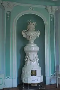La llamada "estufa cerámica", es una variante que se ha empleado antiguamente en países fríos del norte de Europa. Se trata de una estufa como las descritas pero con la particularidad de que las aberturas para carga de combustible y para entrada y regulación de aire se abren hacia un pasillo de servicio, de modo que el aire de combustión no pasa por la habitación a caldear. La estufa propiamente dicha estaba en la propia habitación, y generalmente estaba forrada de azulejos decorativos. De este modo se evitaban del todo los problemas de aireación excesiva que necesita el combustible, para arder, y la carga de combustible y la retirada de cenizas no se hacía por las habitaciones nobles. El calor se difundía en el local por las paredes calientes de la estufa, de cierta inercia térmica, que regulaban el paso del calor, templando la superficie.