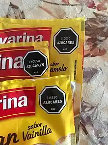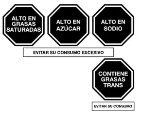 Se realiza una rotulación a través del diseño octagonal de fondo negro y borde blanco de 3,5 por 3,5 cm, que marcan la cantidad de exceso de: sodio, azúcares, grasas y grasas saturadas. El rotulado nutricional es toda descripción destinada a informar al consumidor sobre las propiedades nutricionales que tiene un alimento.[27]Véase también