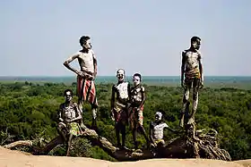- Nyangatom, también donyiro, conocidos antiguamente como 'comedores de elefantes' y ahora como 'pistolas amarillas'. Viven preferentemente en la esquina sudoeste de Etiopía, en el bajo valle del río Omo, en el sudeste de Sudán del Sur, una extensión del lago Turkana habitada desde la prehistoria. Llueve poco y el lugar es cálido y desértico. Hablan el idioma nyangatom (y el daasanech) unas 15.000 personas, en su mayoría animistas, cultivan sorgo, maíz, soja y tabaco, pero prefieren criar cebúes, y utilizan burros en sus migraciones entre Etiopía y Sudán, pues son seminómadas, ya que solo los agricultores pueden permanecer en el valle bajo del Omo a causa de la mosca tse tse.[59] La ceremonia de iniciación incluye el sacrificio de algún animal, y la madurez se alcanza cuando matan a su primer enemigo, que representará una escarificación en el hombro o en el pecho. Solo entonces podrán llevar un arma.[60] En Etiopía son expulsados de sus tierras para realizar plantaciones de caña de azúcar.[61][62]