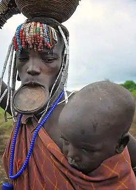 Mujer de la etnia mursi, cercana a los suri o surma. Los suri y los mursi viven al sudoeste de Etiopía y son de los últimos pueblos en utilizar el plato labial, que se empieza a colocar entre los 15 y los 18 años, antes del matrimonio. También lo usan los sara y los lobi de Chad, y los makonde, de Tanzania y Mozambique.