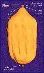 Un pitam se compone de un dad (en hebreo: "דַד"), y un estigma (en hebreo: "שׁוֹשַׁנְתָּא"), y por lo general se cae durante el proceso de crecimiento. Un etrog con un pitam intacto es considerado especialmente valioso, pero aquellas variedades que, naturalmente perdieron su pitam durante el crecimiento, también se consideran kosher. Cuando sólo el estigma se rompe, incluso después de la cosecha, el etrog todavía puede ser considerado kosher, siempre y cuando parte del estilo ha permanecido adjunto. Si todo el pitam, es decir, el estigma y el estilo, han sido rotos hasta la parte inferior, el etrog no es kosher ("apto") para uso ritual.