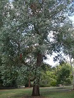 Eucalyptus: nombre genérico que proviene del griego antiguo: eû = "bien, justamente" y kalyptós = "cubierto, que recubre". En Eucalyptus L'Hér., los pétalos, soldados entre sí y a veces también con los sépalos, forman parte del opérculo, perfectamente ajustado al hipanto, que se desprende a la hora de la floración.[3]