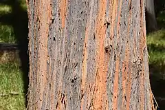 La corteza es gruesa y fibrosa en la base, lisa en las ramas más pequeñas. Entre las subespecies de Tasmania, el tronco entero y las más grandes ramas son de corteza muy gruesa; en las principales subespecies la corteza rugosa se extiende solo parcialmente en el tronco.
