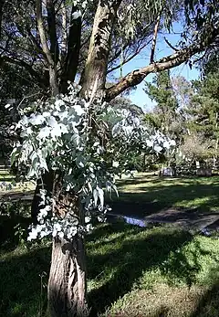 ![]() Corteza y follaje juvenil de Eucalyptus nova-anglica. | ||