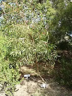 Las hojas adultas son pedunculadas, lanceoladas o curveadas y oblicuas, de 8-12 cm de largo, 1,5-2 cm de ancho, verdes, brillosas, y concolorosas. Las hojas jóvenes y tallos están cubiertos con finos vellos.