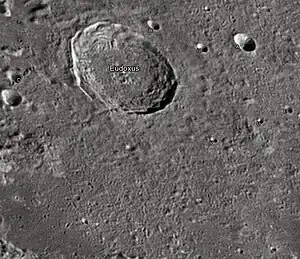 Eudoxus es un destacado cráter de impacto situado en las regiones visibles del norte de la Luna, al este del extremo norte de los Montes Caucasus y al sur del prominente cráter Aristóteles. Al sur aparece un cráter muy deteriorado, Alexander, con el pequeño cráter Lamèch ubicado al suroeste.