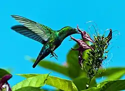 El colibrí caribeño[2], colibrí caribeño gorgiverde, colibrí caribeño gorjiverde, zumbador de pecho azul o zumbador pechiazul (Eulampis holosericeus) es una especie de ave de la familia Trochilidae. La hembra adulta tiene algunas plumas de color naranja al verde claro debajo del pico , mientras el macho adulto tiene verde claro en mayor proporción. También la cola en la hembra adulta es roja-marrón oscuro terminando con las puntas en blanco, la cola del macho es azul oscuro. Tanto hembra como macho adulto tiene una banda azul intensa en el pecho, el vientre de ambos son verde-azul oscuro. La espalda de ambos es color verde con tonos dorados.