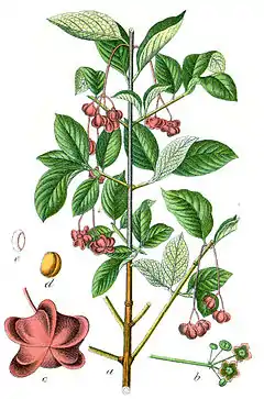 Arbusto de 2-3 (7) m con hojas estrechamente obovadas o elípticas, bastante puntiagudas, de margen más o menos aserradito. Las flores son verdosas, de 5-10 mm de diámetro, dispuestas en ramilletes (cimas) largamente pedunculadas, sobre cabillos de algo más de un centímetro; tienen un disco nectarífero verdoso. hay 84) 5 pétalos redondeados, de hasta 3 cm, casi el doble de largos que los sépalos, teñidos generalmente de rosa o de púrpura y 4(5) estambres casi sentados. Los frutos son algo deprimidos, colgantes. Las semillas son elipsoidales rodeadas de una cubierta anaranjada.[1]