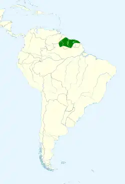 Puede encontrarse en los siguientes países: Brasil, Guayana Francesa, Guayana, Surinam y Venezuela. Sus hábitats naturales son los bosques tropicales húmedos de baja altitud y los bosques secundarios.