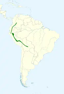 Habita en los bosques húmedos de Bolivia, Colombia, Ecuador y Perú.
