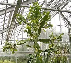 Planta suculenta[1] de porte arbóreo que alcanza de 10 a 30 m de altura. Las ramificaciones surgen de forma irregular a lo largo del tronco principal (que puede medir hasta 90 cm de diámetro), están formadas por tallos aplanados, con 3 aristas de márgenes sinuosos del borde de los cuales surgen las hojas de forma espatulada que van cayendo a medida que crecen las ramas, conservándose únicamente en el ápice de estas. Las pequeñas inflorescencias unisexuales llamadas ciatos son exclusivas del género Euphorbia.