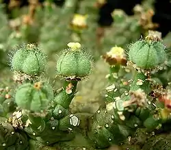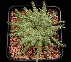 Es una planta perenne enana con hojas suculentas, sin espinas, pero con restos persistentes de los pedúnculos de sus ramas, el cuerpo de la planta es obconico, plano en la parte superior y no marcado por las líneas de depresión octogonales de las áreas aplanadas. Las hoja caducas, ovadas, agudas: Las inflorescencias en 2-4 pedúnculos que surgen de las axilas en los extremos de las ramas, con diminutas brácteas caducas, involucro solitario.[1]