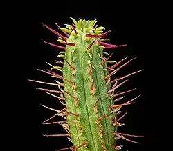 Euphorbia: nombre genérico que deriva del médico griego del rey Juba II de Mauritania (52 a 50 a. C. - 23), Euphorbus, en su honor – o en alusión a su gran vientre – ya que usaba médicamente Euphorbia resinifera. En 1753 Carlos Linneo asignó el nombre a todo el género.[4]