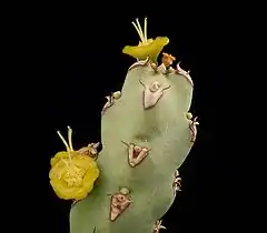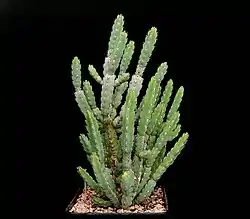 Es una planta suculenta, débilmente espinulosas, arbusto enano, ramificado desde la base, formando grandes grupos ramificados densamente, de ± 15 cm de alto, las ramas o subcilíndricas subcuadrangulares, de ± 8.10 mm de diámetro, disminuyendo en como en una base del tallo.[1]
