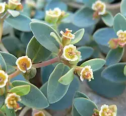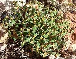 Se trata de un conjunto de plantas que forman una alfombra o macizo de color rojizo-verde con un retorcido tallo rastrero, lampiño. Las hojas son redondeadas, ovales o en forma de pala, suave a lo largo de los bordes y de no mucho más que un centímetro de longitud máxima. La pequeña inflorescencia es un ciatio de color blanco con filo, festoneado con flores en torno. Hay un anillo de 25 a 35 flores masculinas alrededor de una flor femenina. El ovario de la flor femenina es lobulado y se convierte en una fruta cerca de 2 milímetros de largo.