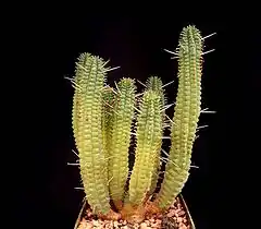 Es una planta suculenta, que alcanza un tamaño de 25 a 90 cm de altura, sin hojas, más o menos espinosa, erecta, ramificada en forma agrupada o más o menos verticiladas, dioica, con las ramas ascendentes o erectas, pero a veces decumbentes y enraizamiento en la base, con 7-12 ángulos, glabras, de color verde claro, llegando a ser de color marrón con la edad; los ángulos no dispuestos en espiral, son prominentes; espinas (pedúnculos modificados) solitarias en las axilas de los tubérculos.[2]