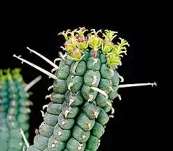 Euphorbia: nombre genérico que deriva del médico griego del rey Juba II de Mauritania (52 a 50 a. C. - 23), Euphorbus, en su honor – o en alusión a su gran vientre – ya que usaba médicamente Euphorbia resinifera. En 1753 Carlos Linneo asignó el nombre a todo el género.[4]