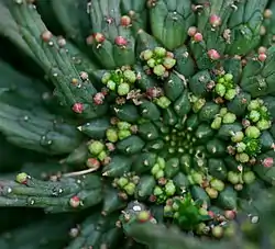 Es una planta suculenta enana, sin espinas, con el cuerpo principal de la planta globoso o obconico, con una corona de ramas cortas radiantes en 3-5 series alrededor de un área central plana o deprimida;. disco cubierto de agudos tubérculos cónicos glabros de color verde, opaca o más o menos teñida con púrpura. Las hojas rudimentarias, sólo están presente en el crecimiento de los jóvenes y caducan pronto, son amplias, lanceoladas o elípticas, agudas, glabras. La inflorescencia solitaria en las axilas de los tubérculos del disco y ramas, erecta, robusta, teniendo un involucro y 3-5 diminutas brácteas ciliadas. El fruto en forma de cápsula subglobosa, con semillas ovoides, agudas en un extremo, minuciosamente tuberculados, excepto a lo largo de un espacio estrecho por el lado ventral, de color gris-negruzco.