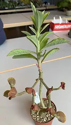Euphorbia: nombre genérico que deriva del médico griego del rey Juba II de Mauritania (52 a 50 a. C. - 23), Euphorbus, en su honor – o en alusión a su gran vientre – ya que usaba médicamente Euphorbia resinifera. En 1753 Carlos Linneo asignó el nombre a todo el género.[6]