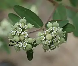 Las flores de estas plantas se encuentran muy modificadas; la estructura que parece una flor, es decir la que lleva el ovario y los estambres, es en realidad una inflorescencia llamada ciatio, que en su interior lleva numerosas flores masculinas (representadas exclusivamente por estambres desnudos) y una flor femenina (representada por un ovario con 3 estilos, cada uno dividido en 2 ramas). Estos ciatios son como tubos verdosos, a veces algo acampanados y en el ápice presentan amplios apéndices blancos o rosados parecidos a pétalos, y además unas glándulas prominentes, elípticas, de color café a rojizo. El fruto es seco, es una cápsula trilobada, de hasta 1.8 mm de largo, cubierta de pelillos, al madurar se abre elásticamente liberando sus 3 semillas que son ovoides, 4-anguladas, con crestas transversales sobre sus caras, de color café a gris.